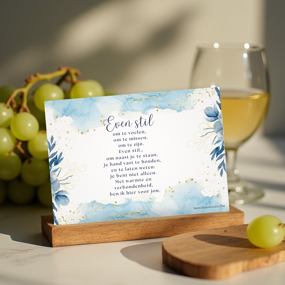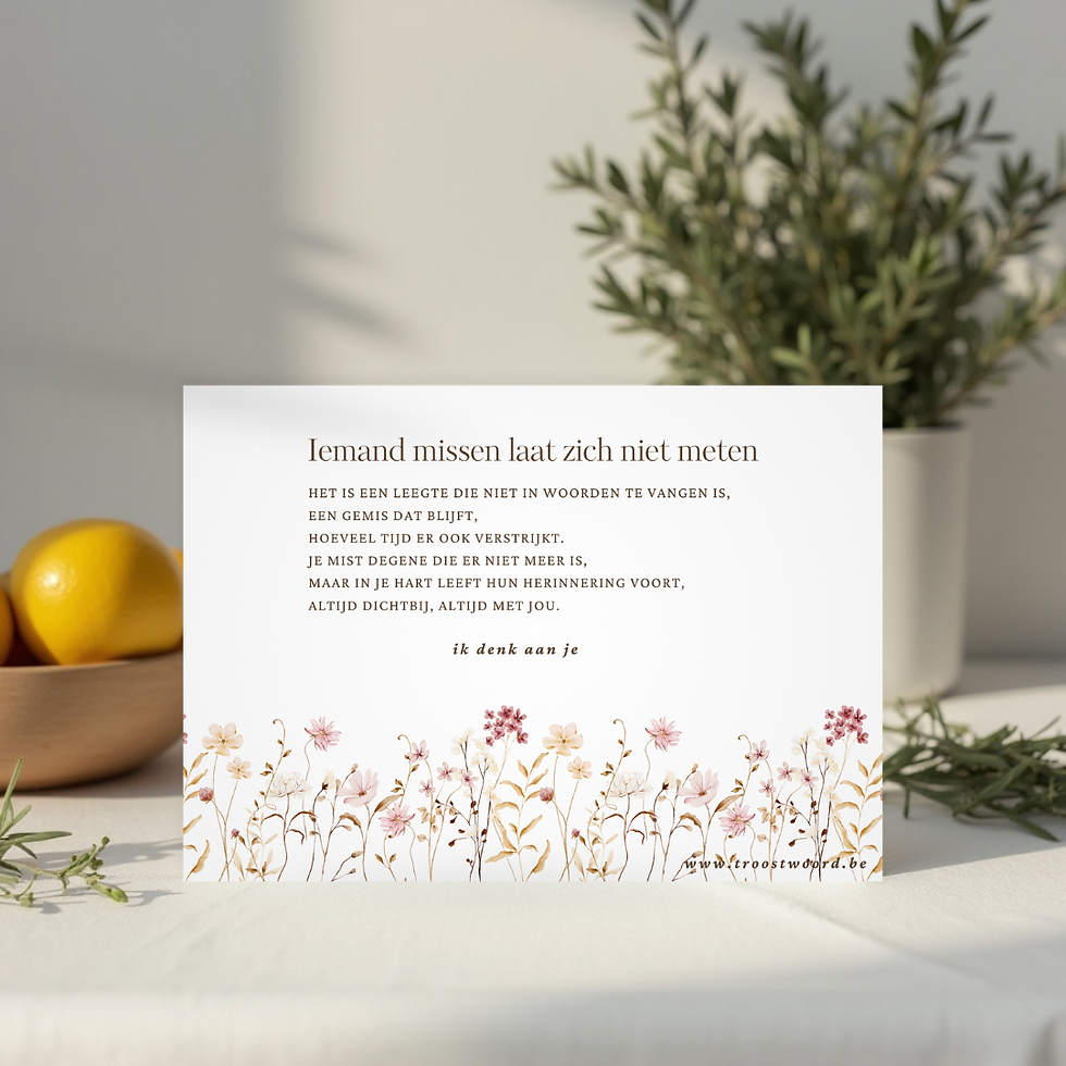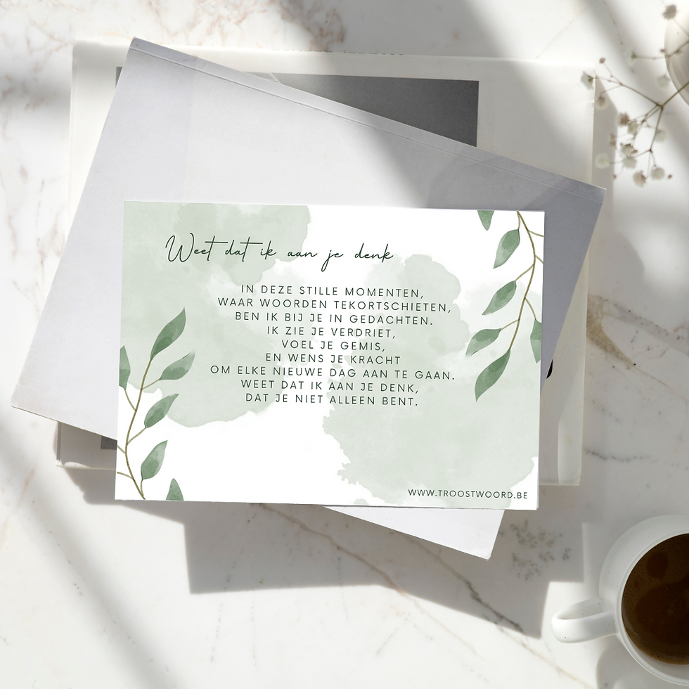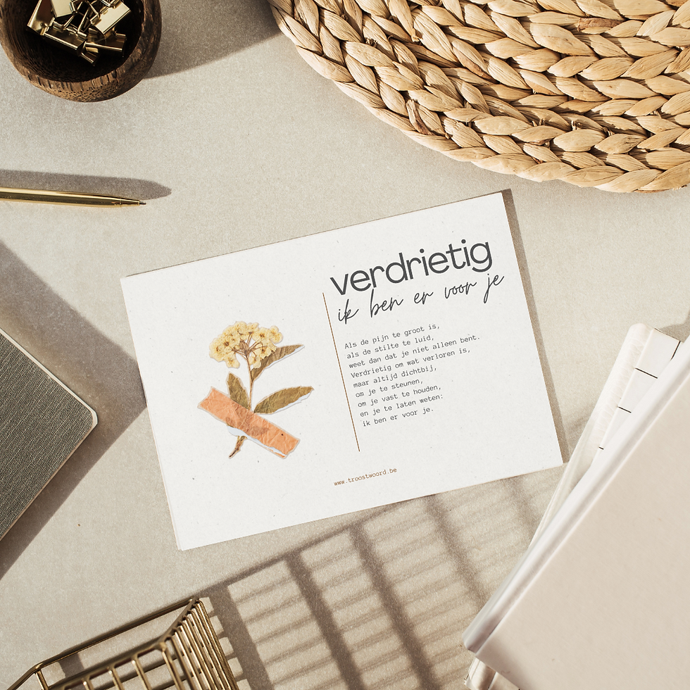 Soms schieten woorden tekort, maar een kaart kan zeggen wat we zelf niet kunnen uitspreken. Bij Troostkaarten ontwerp en schrijf ik met zorg en liefde kaarten die warmte, steun en een vleugje licht bieden in moeilijke tijden.